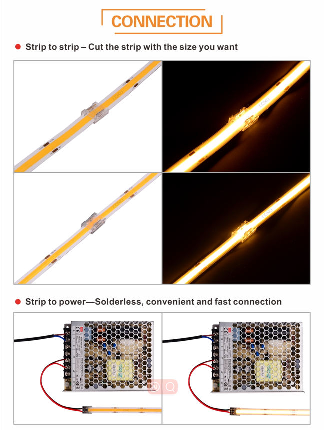 Strip-To-Strip | · Transparent PC connector for high density(240led strip) and COB strip · 2 Pin, 6mm, IP20, 2 heads · Strip to wire without soldering, 15CM white naked 22AWG wire · 0-36V, 5A |