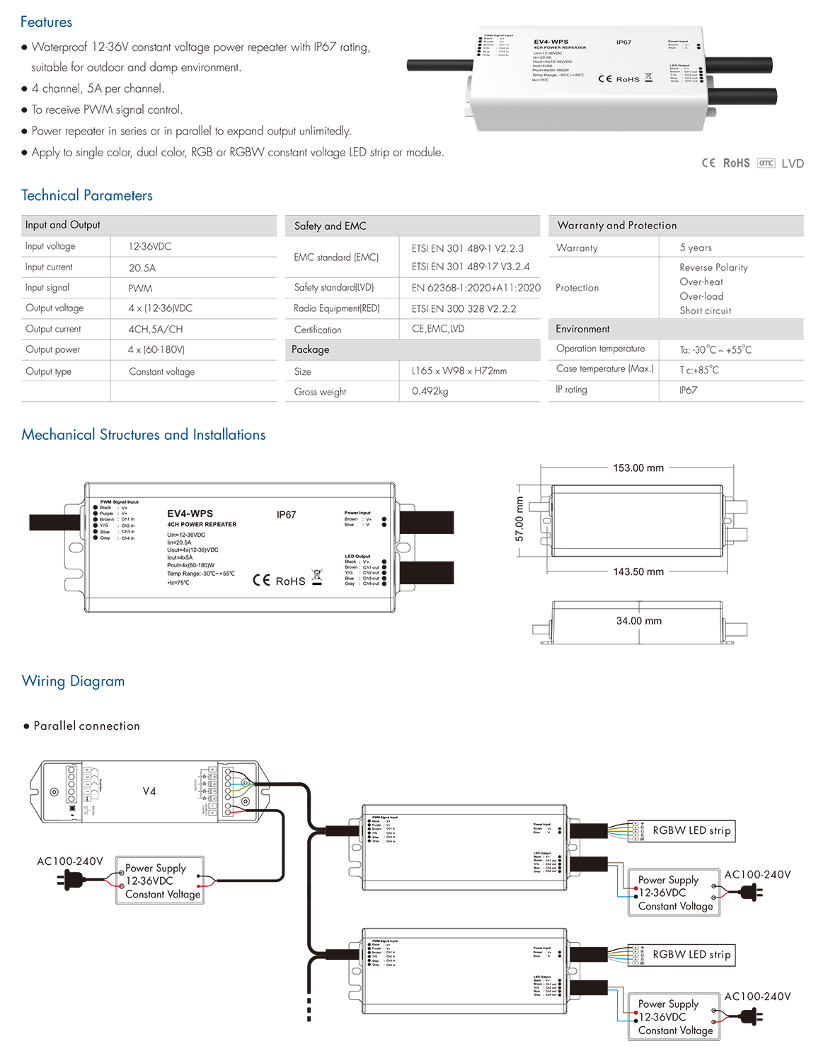 EV4-WPS Amplifier for RGB and RGBW Controller