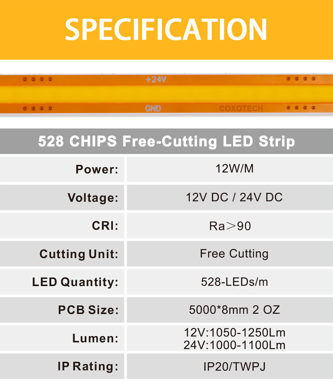 M5000 528leds Ra90 5 Years Warranty 8mm Free Cutting COB LED Strip