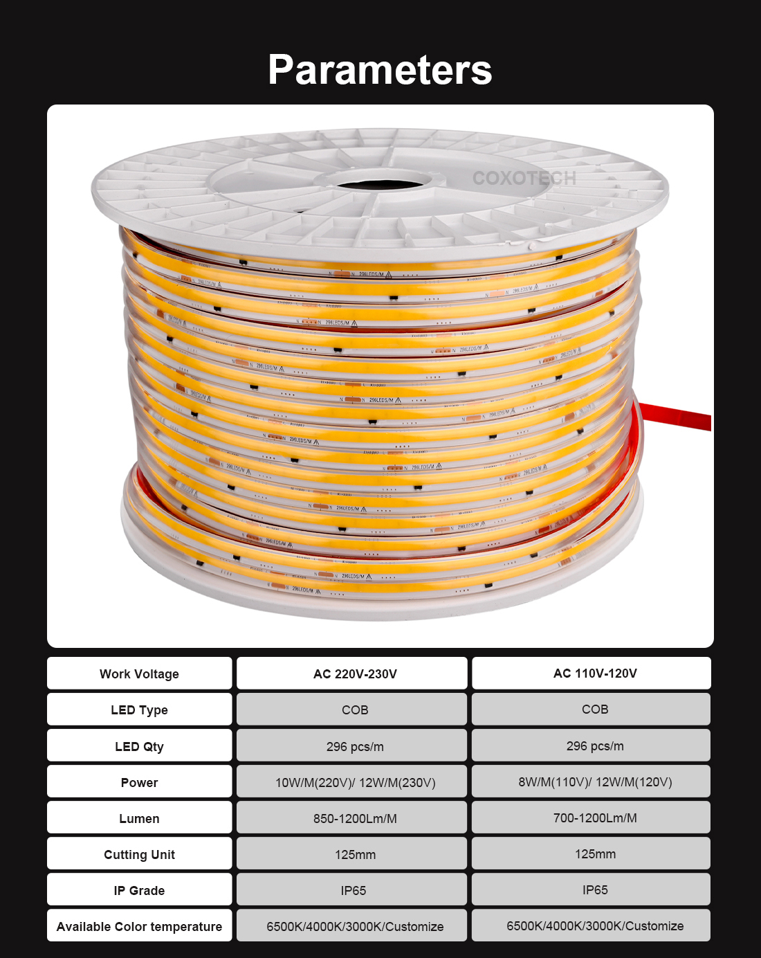 J2000-E 296leds Ra80 2 Years Warranty 10mm 110V-120V High Voltage COB LED Strip