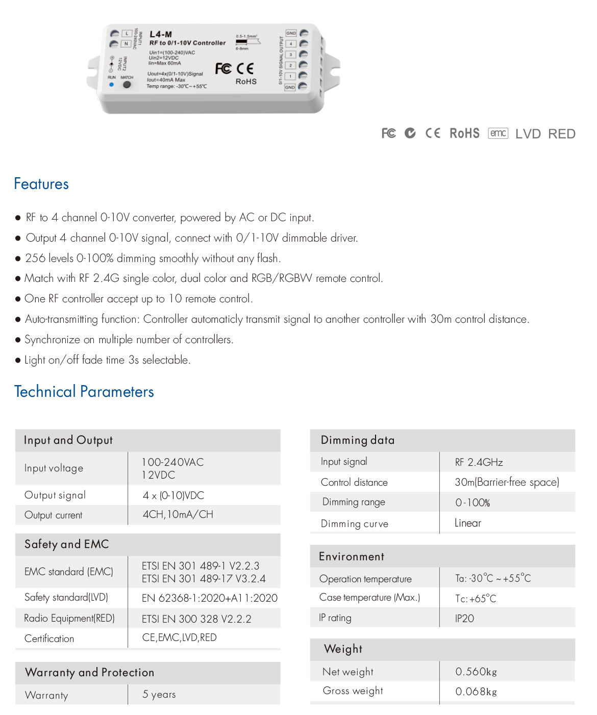 L4-M 4 Channels RF LED Dimmer Switch