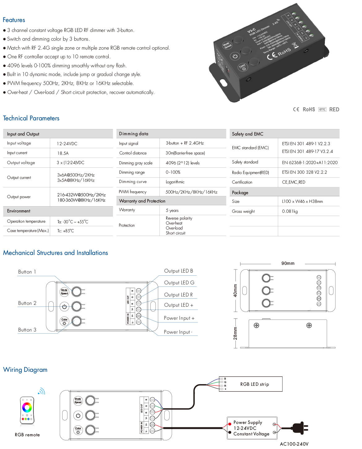 V3-C High Power RF LED RGB Controller with Manual button LED Dimmer