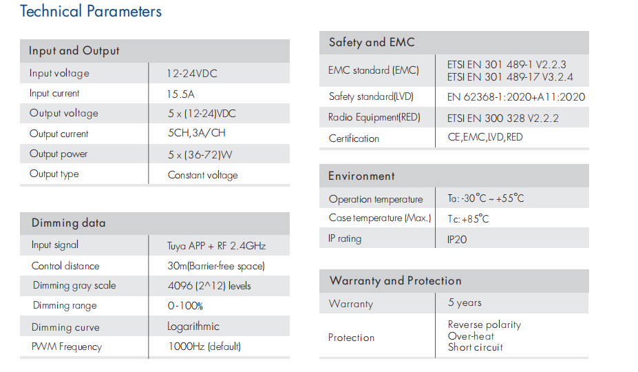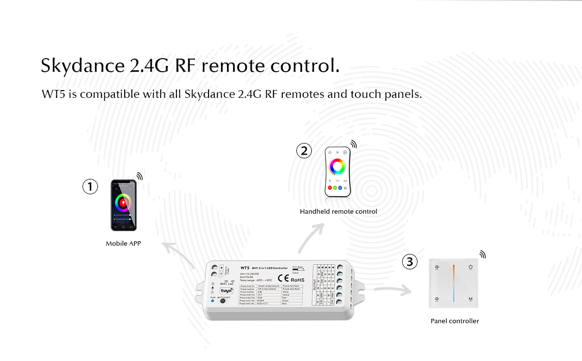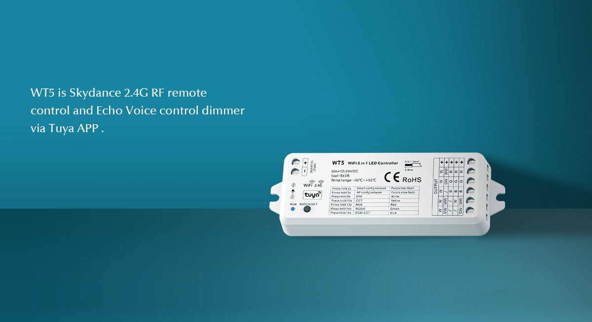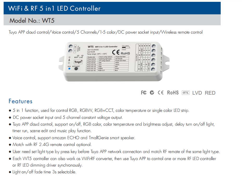WT5 RF Remote control 5 years warranty Tuya WIFI 5 channel RGB/RGBW/CCT/Dimming 5 in 1 led controller